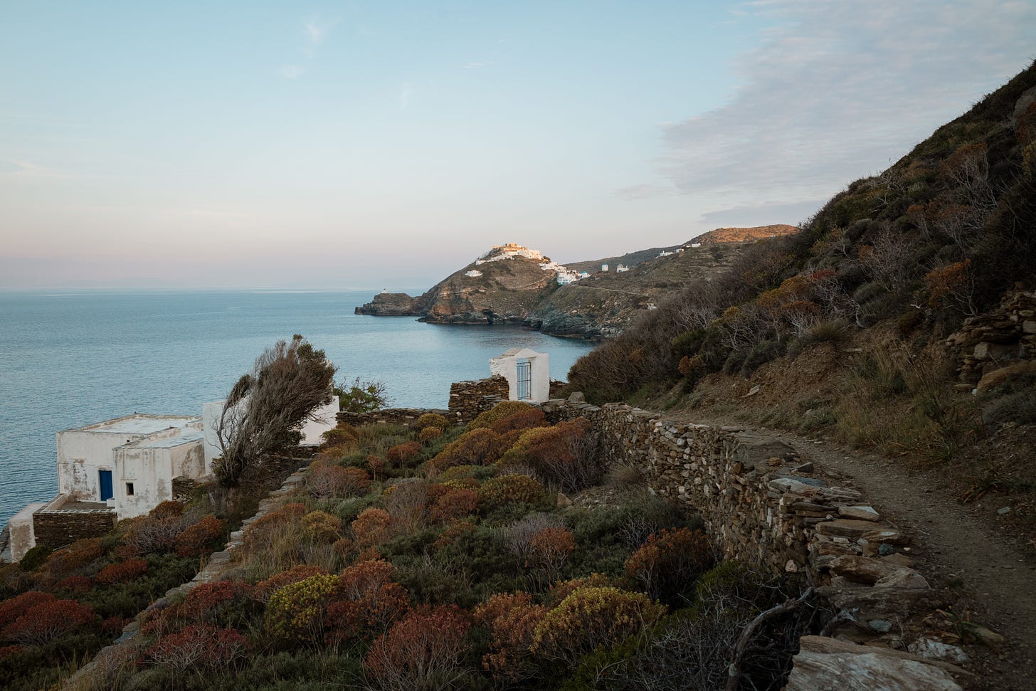 From this point, I spent a lot of time walking in such a small place as I waited for my next recommendation, Kavos Sunrise, to open. The views in Kastro from the high path that runs along the edge of a cliff are some of the most beautiful in the Cyclades. Eventually, I found my way to the steps that wound down to the Church of the Seven Martyrs, an iconic monastery set on a rock above the sea. It was easy to see how most people spend a day or even a few hours in Sifnos, but I’ve realized over the years that these are the places I love. A small touristic town after the crowds disappear (although in this case, I was one of about six people in the village since it was the end of May and not yet tourist season) is something I’ve grown to appreciate. I walked on through the maze of streets until I started to feel hungry, at which point, I followed a zig-zag path down the hill that Kastro is set on to a small cove below where there were a few fishing shacks and one restaurant.