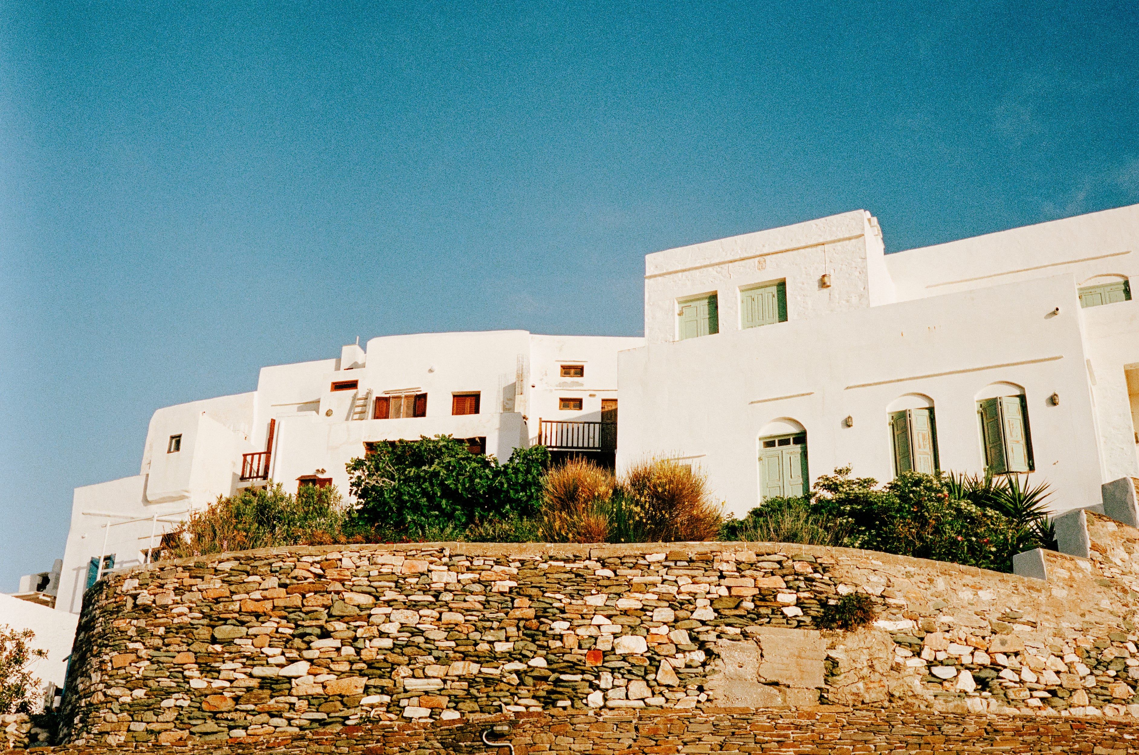 When we finally arrived in Kastro, my driver swiftly turned the car around and drove in reverse up a hill I would have struggled to go up facing forward. From there, the road ended, and I was left to climb a series of stairs and pathways in this ancient, 14th-century settlement. I made my way to the door of the home I was staying in and dropped my bags in a real-life hobbit home of my dreams. Wooden beams set into the white plaster accented the one-room home, which had a small kitchen, dining table, bathroom, and two twin beds with beautiful stone floors and a few tiny windows. Embroidered tableclothes, French doors, white curtains, ancient appliances—all the makings of a perfect home by the sea. The house itself was set into the hill, which I soon realized provided a natural air conditioning system to combat the stifling Greek summer heat. I washed my hands and face after opening my bag and set out for a walk through the town.